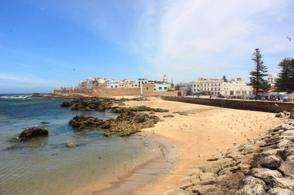 Essaouira’s main beach stretches for miles along the coastline. The beach is perfect for swimming, sunbathing, and beach walks. The consistent breeze keeps temperatures comfortable even on warm days.